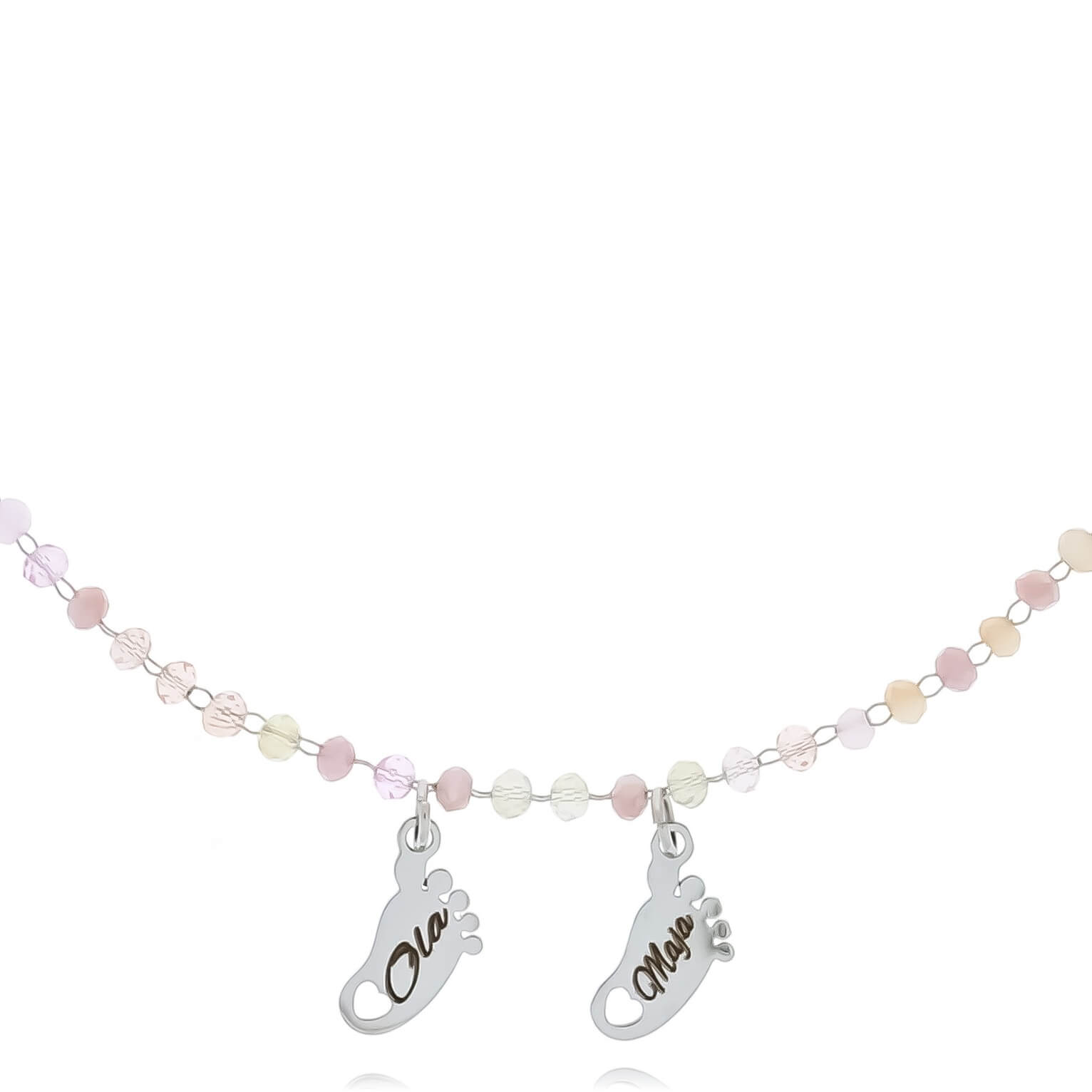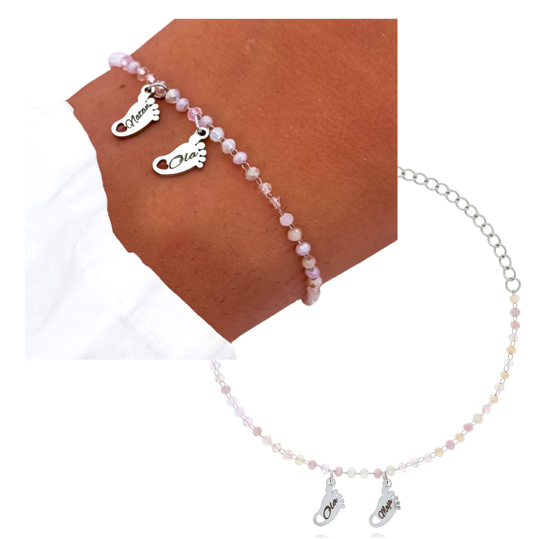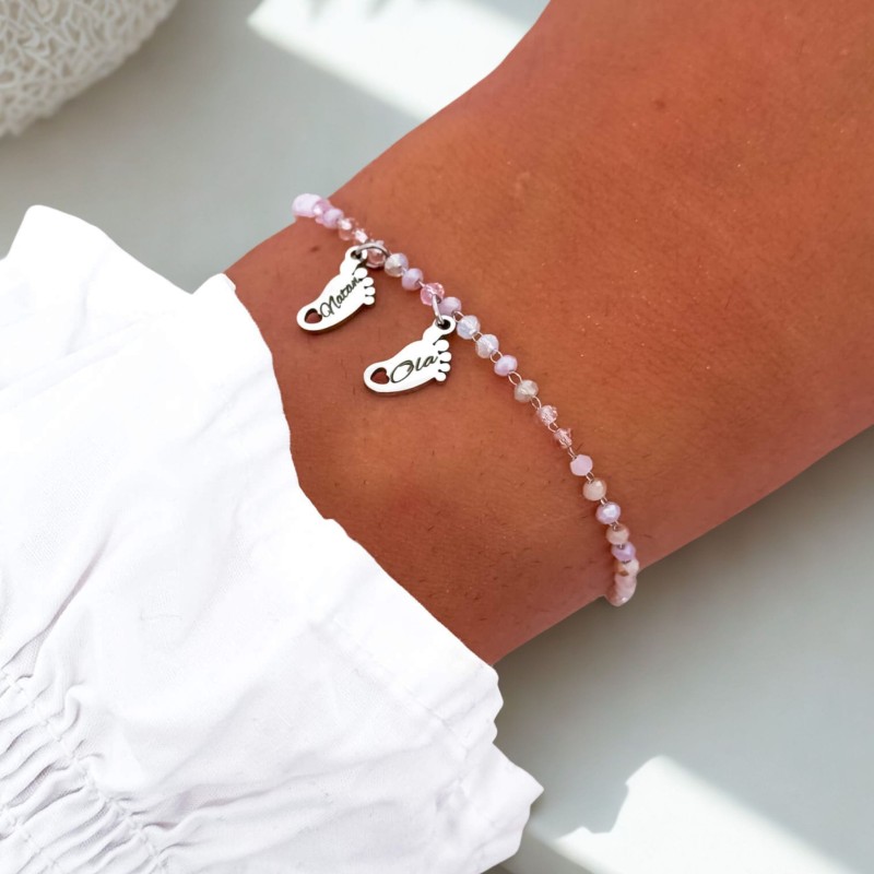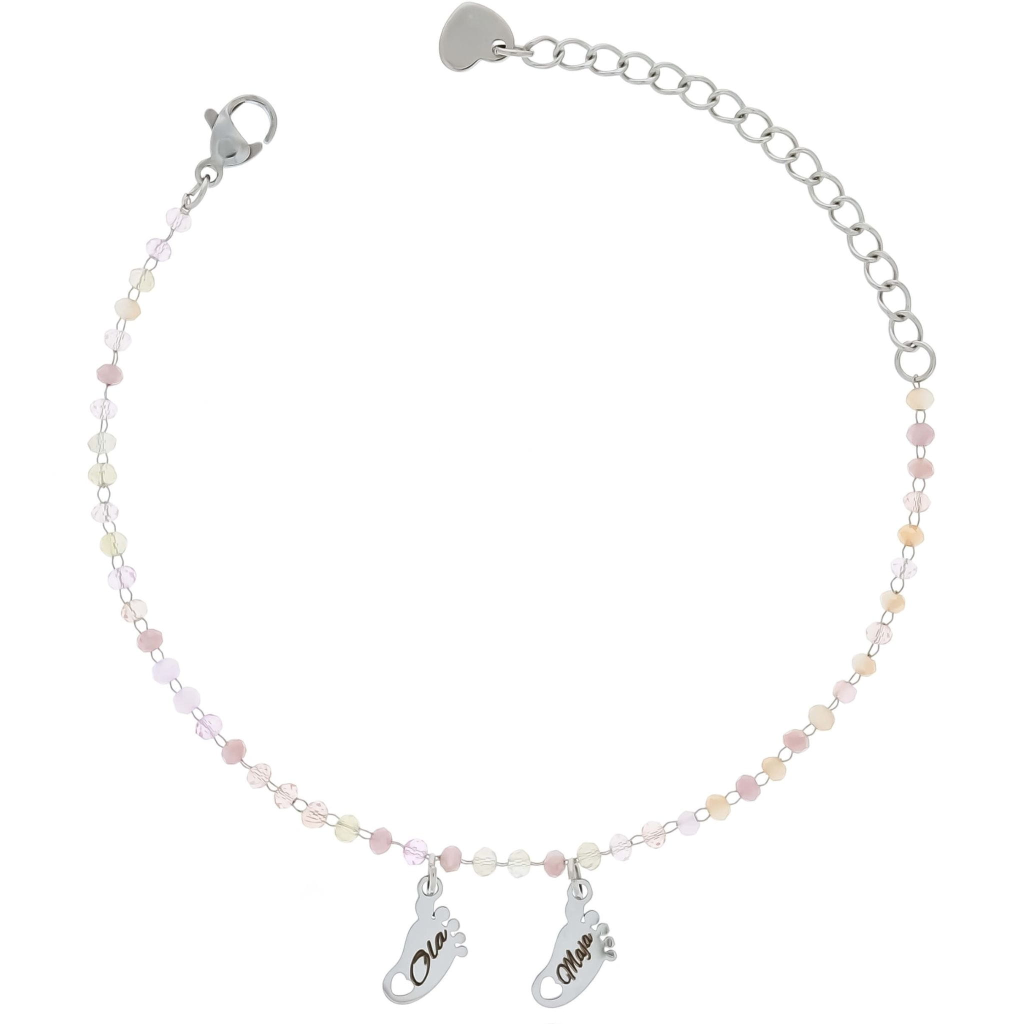 Biżuteria dla mamy – srebrna bransoletka ze stali chirurgicznej z dwiema stópkami i kolorowymi koralikami z możliwością graweru imion