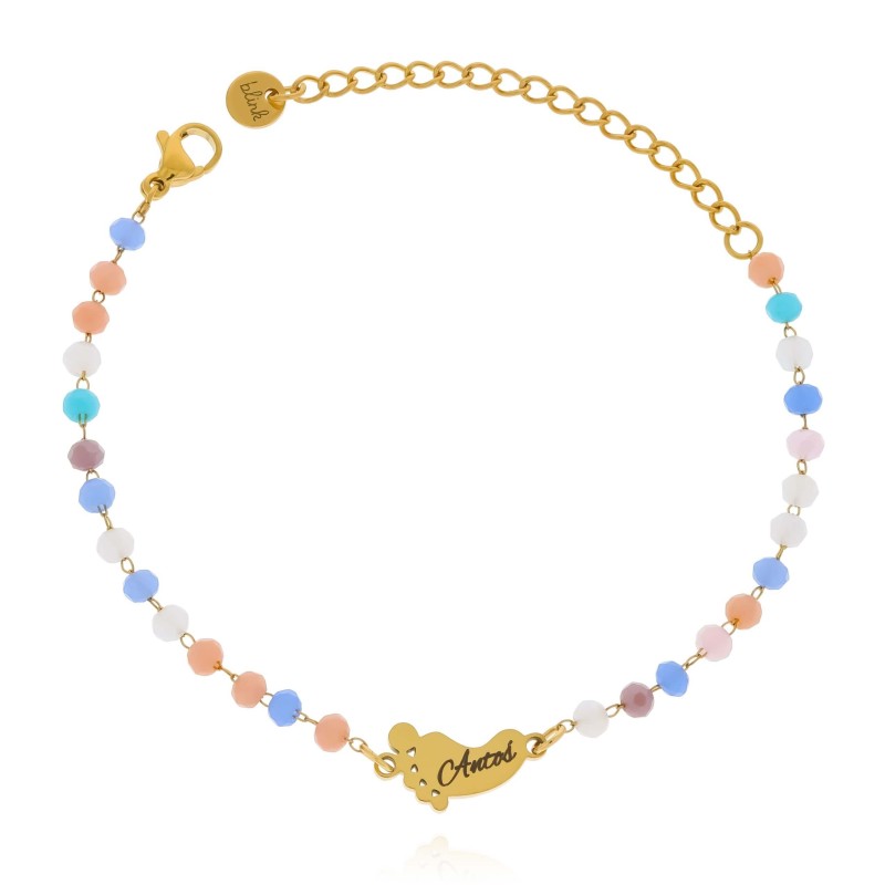 Stwórz niepowtarzalny look z naszą uroczą bransoletką, zdobioną delikatnymi różowymi koralikami. Zawieszka w kształcie stópki dodaje uroku, a możliwość wygrawerowania imienia sprawi, że stanie się ona niezapomnianym akcentem osobistym. Idealna na prezent dla siebie lub bliskiej osoby.