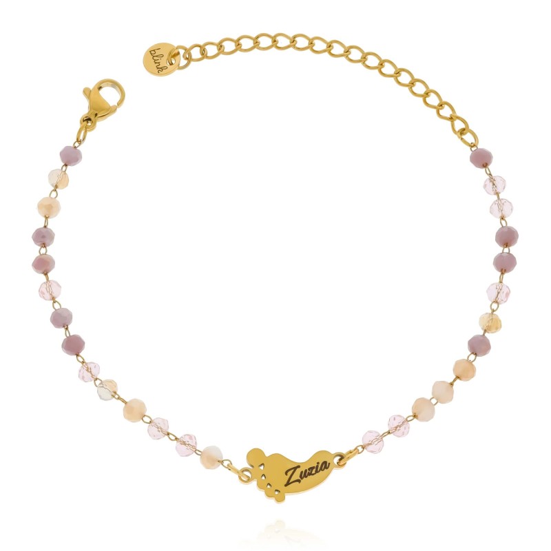 Stwórz niepowtarzalny look z naszą uroczą bransoletką, zdobioną delikatnymi różowymi koralikami. Zawieszka w kształcie stópki dodaje uroku, a możliwość wygrawerowania imienia sprawi, że stanie się ona niezapomnianym akcentem osobistym. Idealna na prezent dla siebie lub bliskiej osoby.