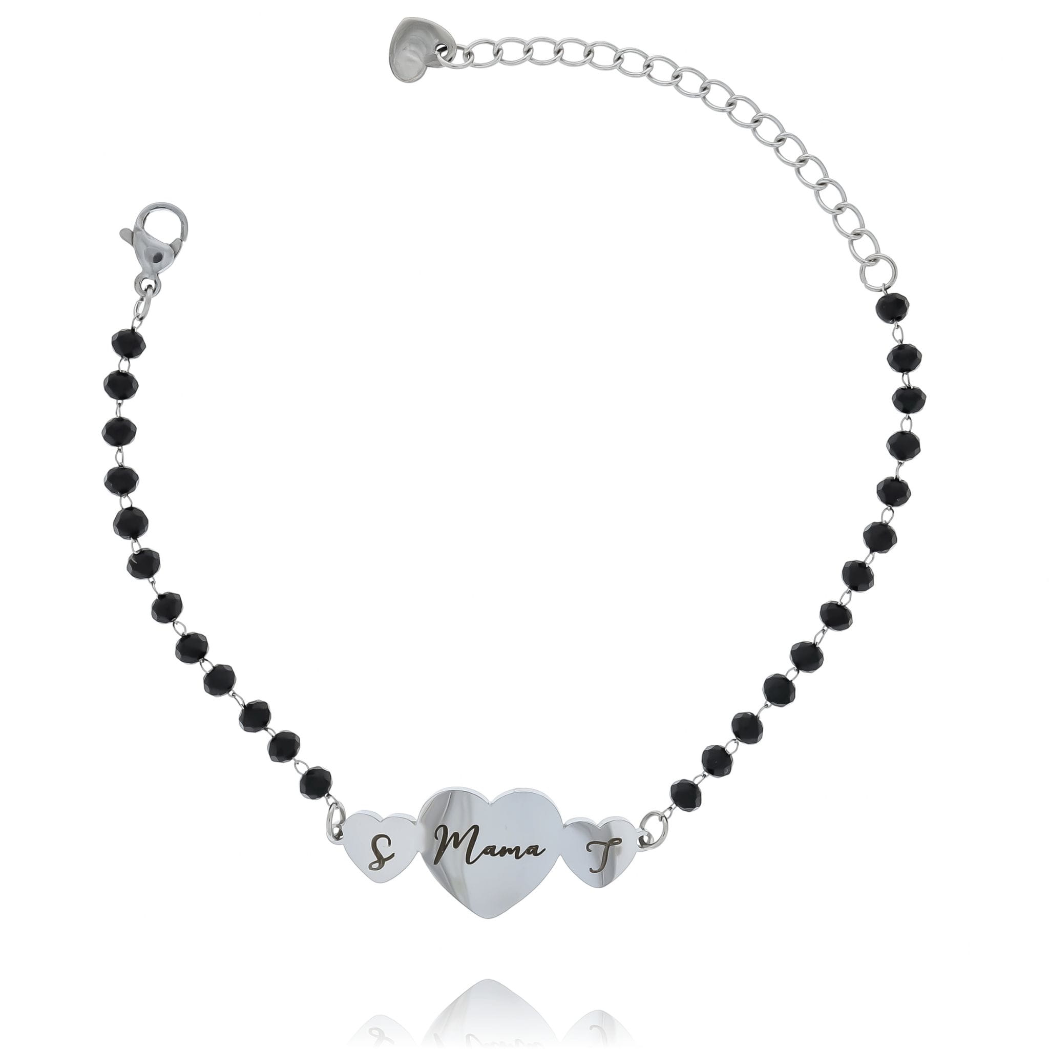 Wyjątkowa bransoletka ze stali chirurgicznej 316L w kolorze srebrnym, ozdobiona eleganckimi czarnymi koralikami. W centralnej części znajduje się większe serce z grawerem Mama, a po jego bokach dwa mniejsze serduszka, na których można umieścić inicjały dzieci.