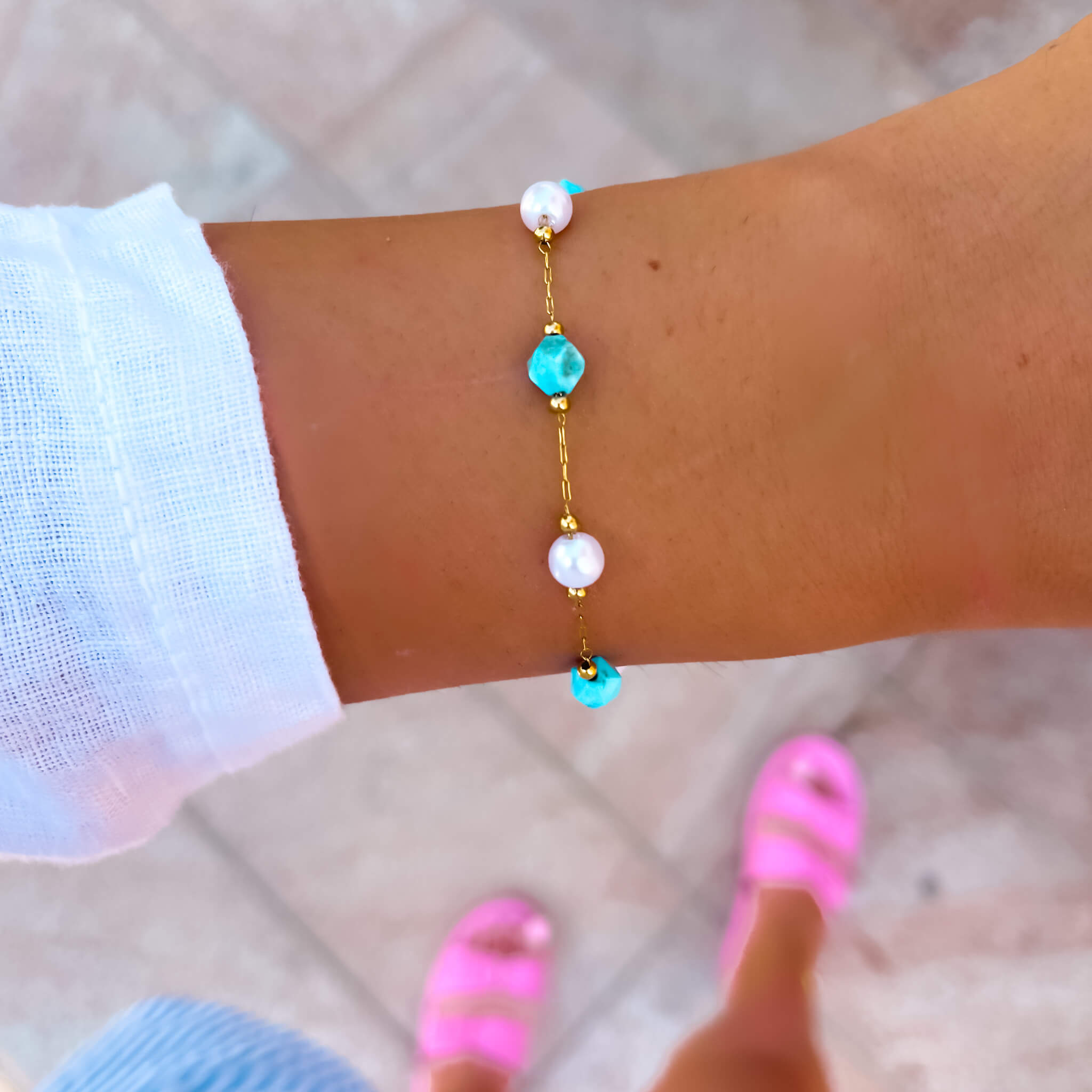 Bransoletka z turkusem i perłowymi koralikami to doskonały wybór dla miłośników stylowej i wyrafinowanej biżuterii. Idealna jako prezent dla bliskiej osoby lub jako wyjątkowy dodatek do własnej kolekcji. Wybierając naszą bransoletkę, zyskujesz nie tylko modny dodatek, ale także biżuterię, która podkreśli Twoją indywidualność i styl.