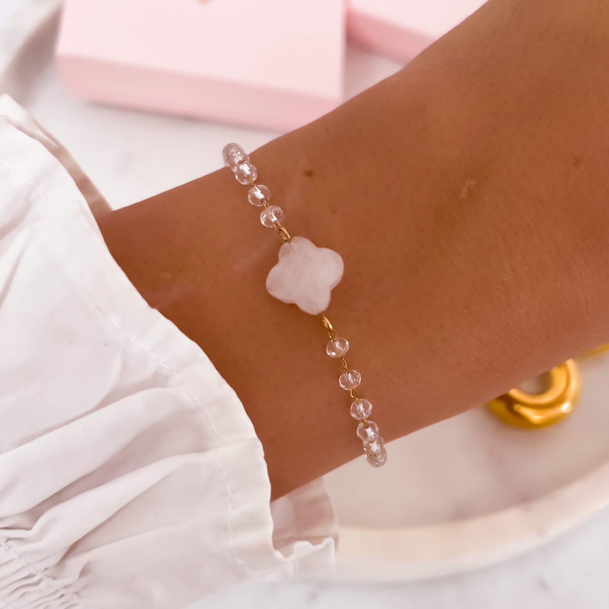 Ożyw swoją stylizację naszą uroczą bransoletką z kwiatkiem. To nie tylko biżuteria, to wyjątkowy akcent natury i elegancji, który podkreśli Twój indywidualny styl. Kryształ górski dodaje subtelności, a koraliki tworzą harmonijne połączenie, emanujące delikatnością i kobiecym wdziękiem. Kwiatowy motyw nadaje bransoletce niepowtarzalnego uroku, podkreślając piękno natury.