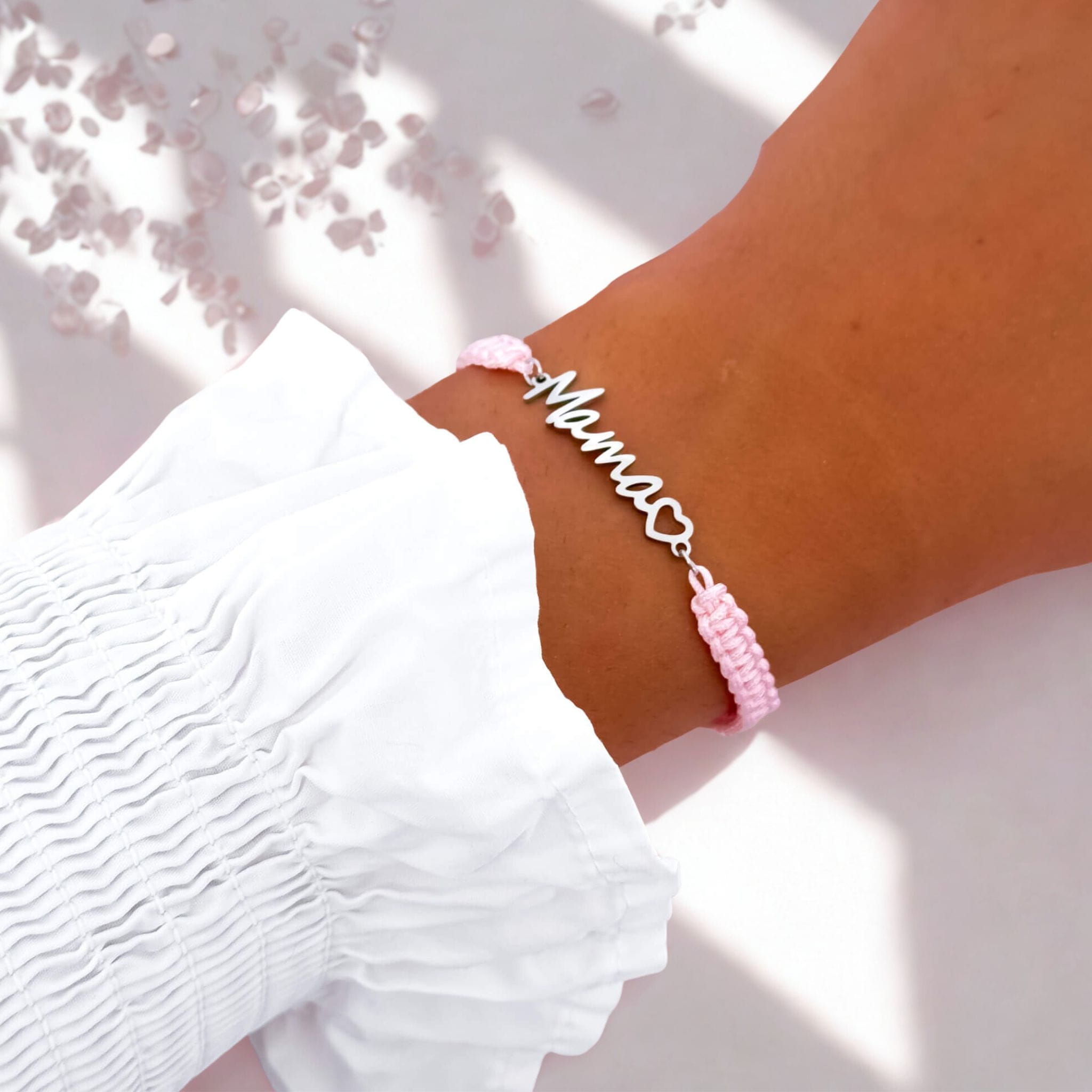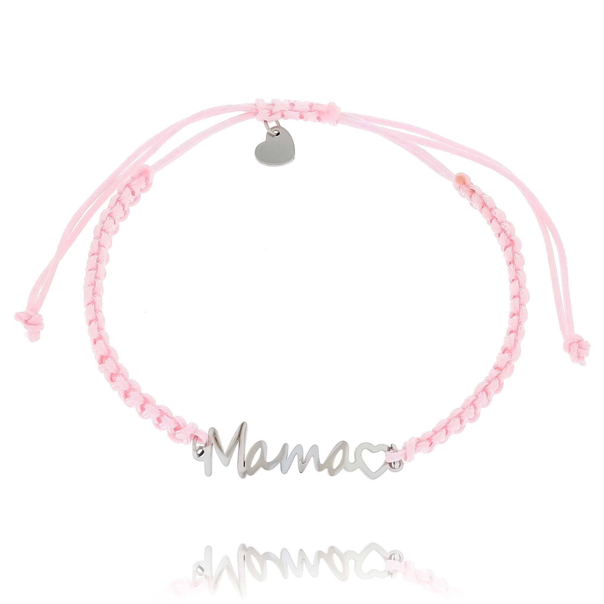 Bransoletka z napisem Mama na regulowanym różowym sznurku elegancka srebrna zawieszka prezent