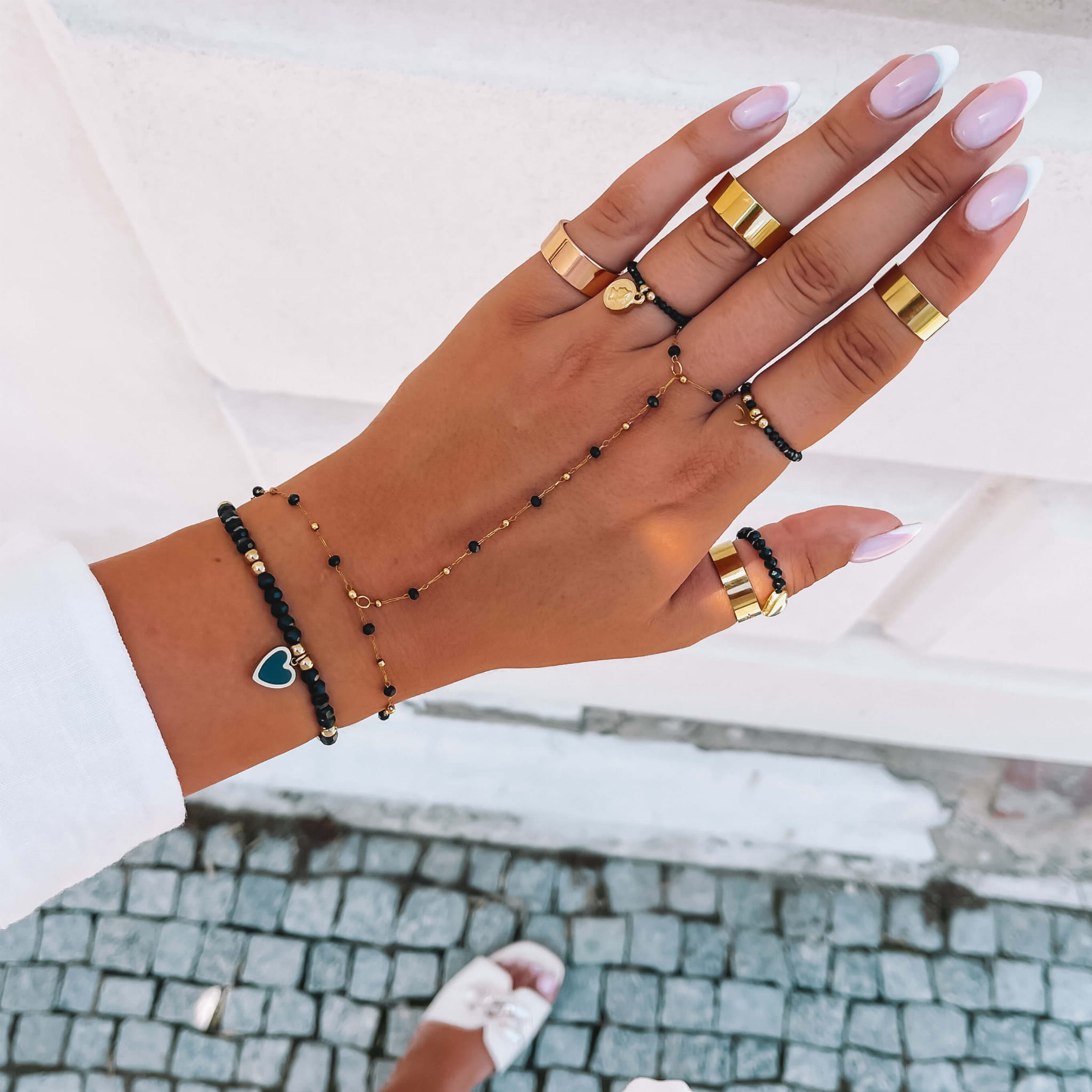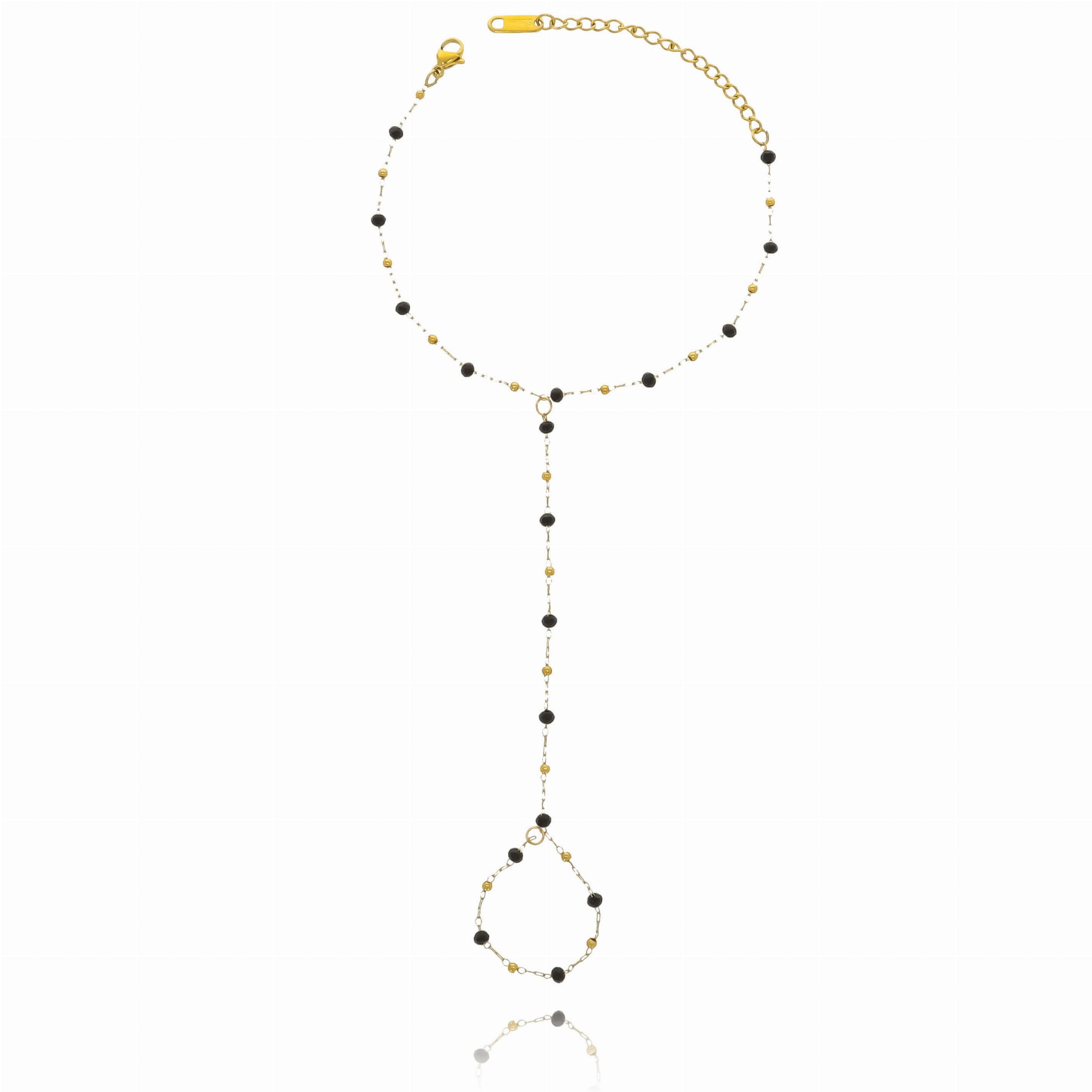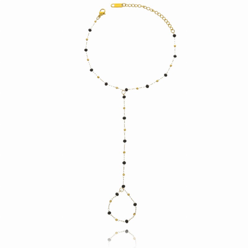 Bransoletka z pierścionkiem na palec z czarnymi koralikami stal chirurgiczna
