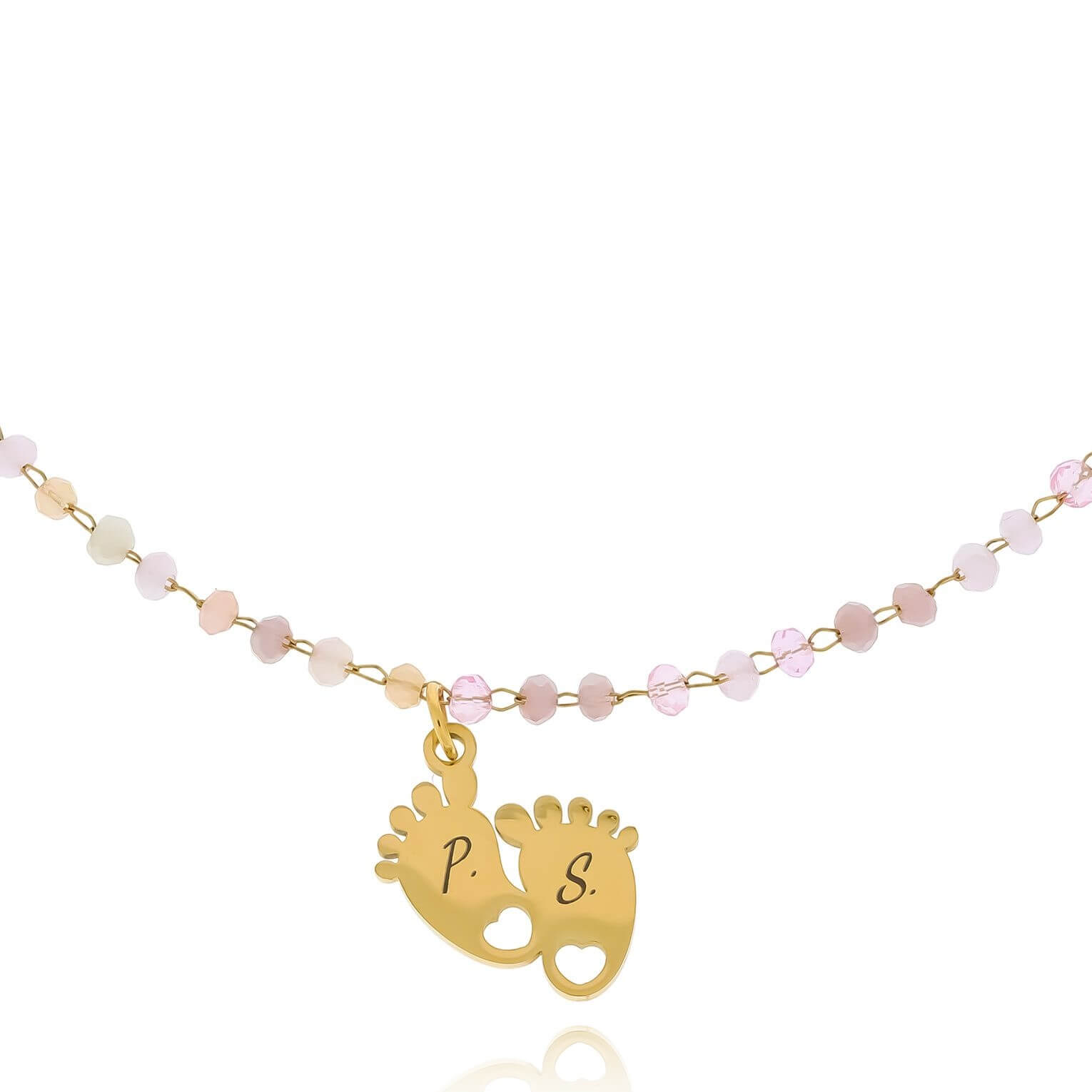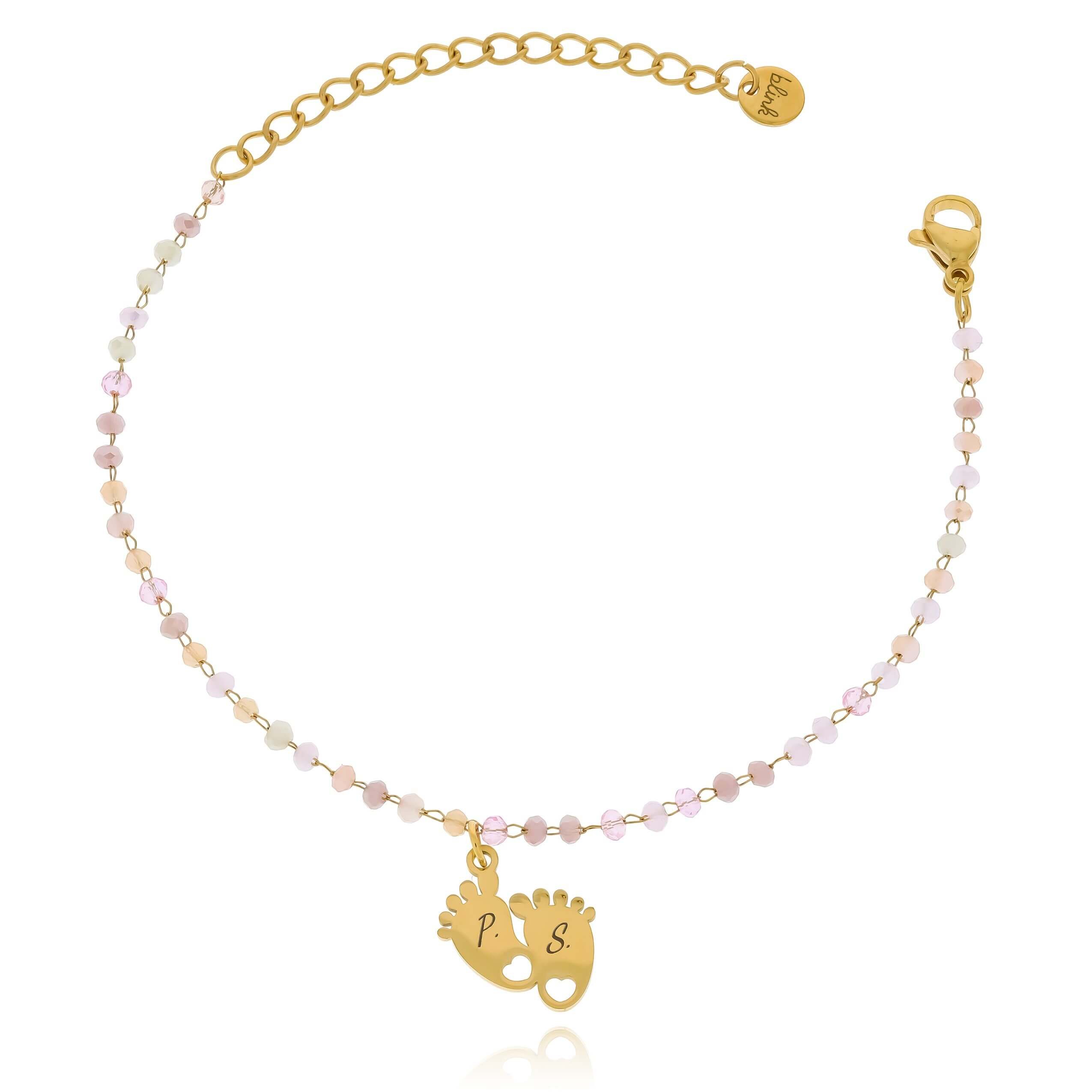 Stwórz niepowtarzalny look z naszą uroczą bransoletką, zdobioną delikatnymi różowymi koralikami. Zawieszka w kształcie stópek dodaje uroku, a możliwość wygrawerowania inicjałów sprawi, że stanie się ona niezapomnianym akcentem osobistym. Idealna na prezent dla siebie lub bliskiej osoby.