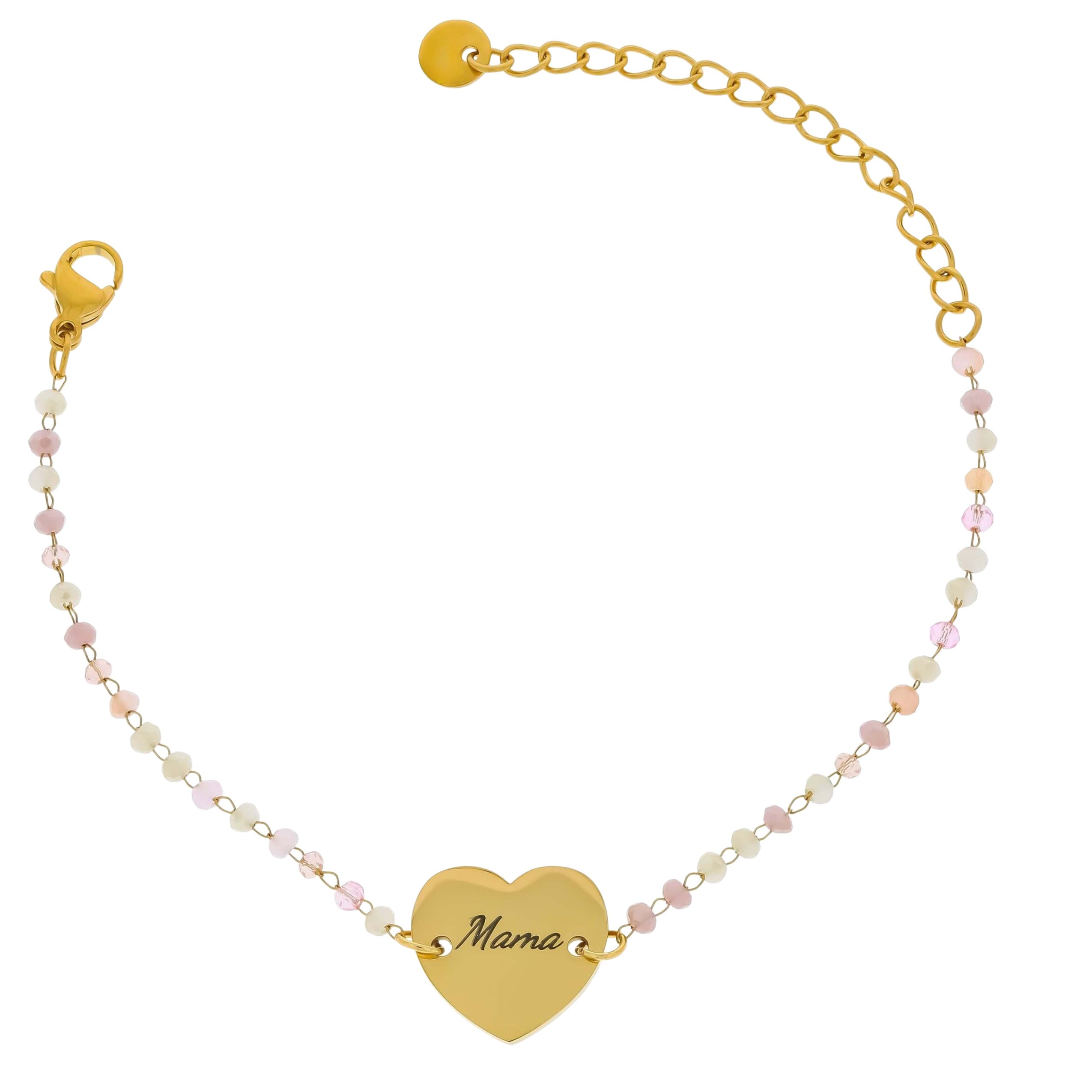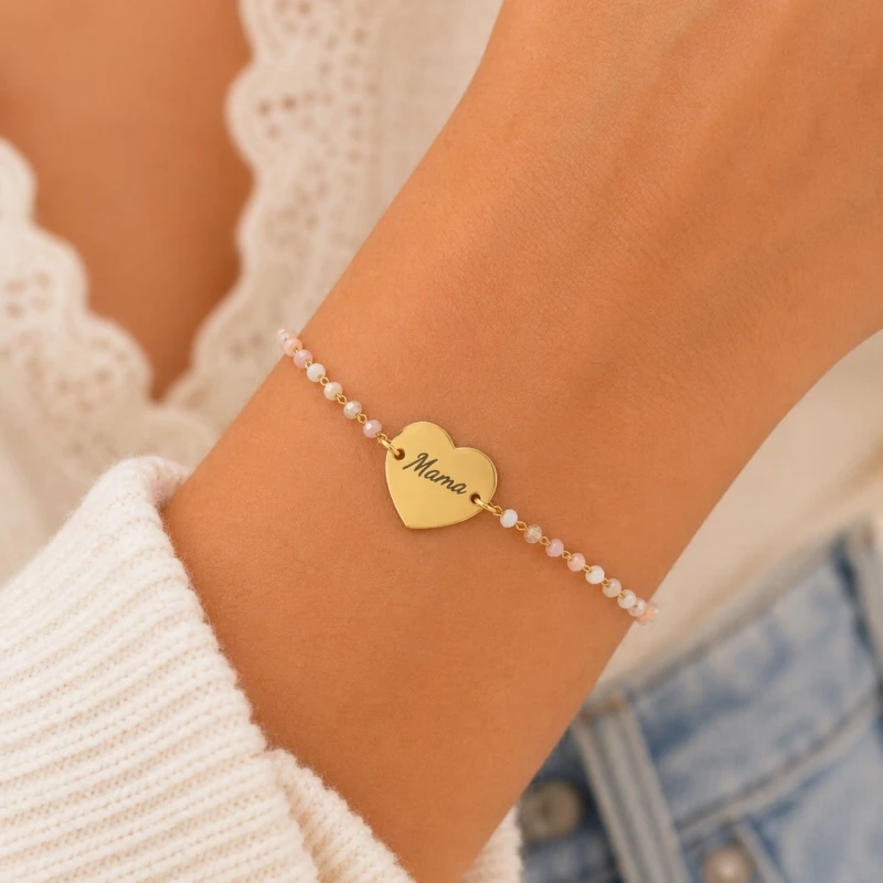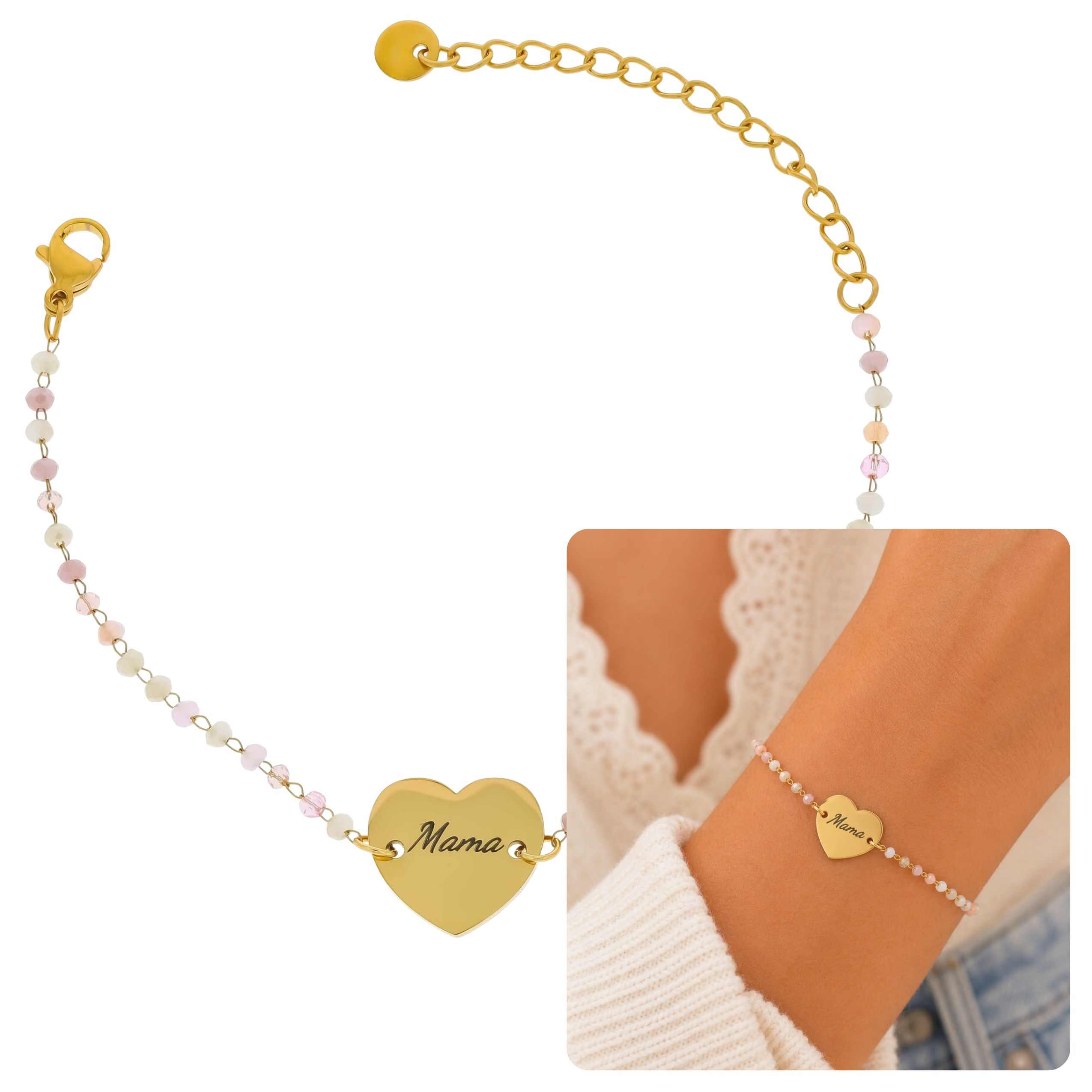 Personalizowany grawer na serduszku dodaje niepowtarzalnego charakteru, sprawiając, że staje się ona wyjątkowym wyrazem miłości i bliskości. Wykonana z trwałej stali gwarantuje długotrwałe użytkowanie bez utraty blasku. Różowe koraliki dodają delikatnego uroku, idealnie komponując się z sercem.