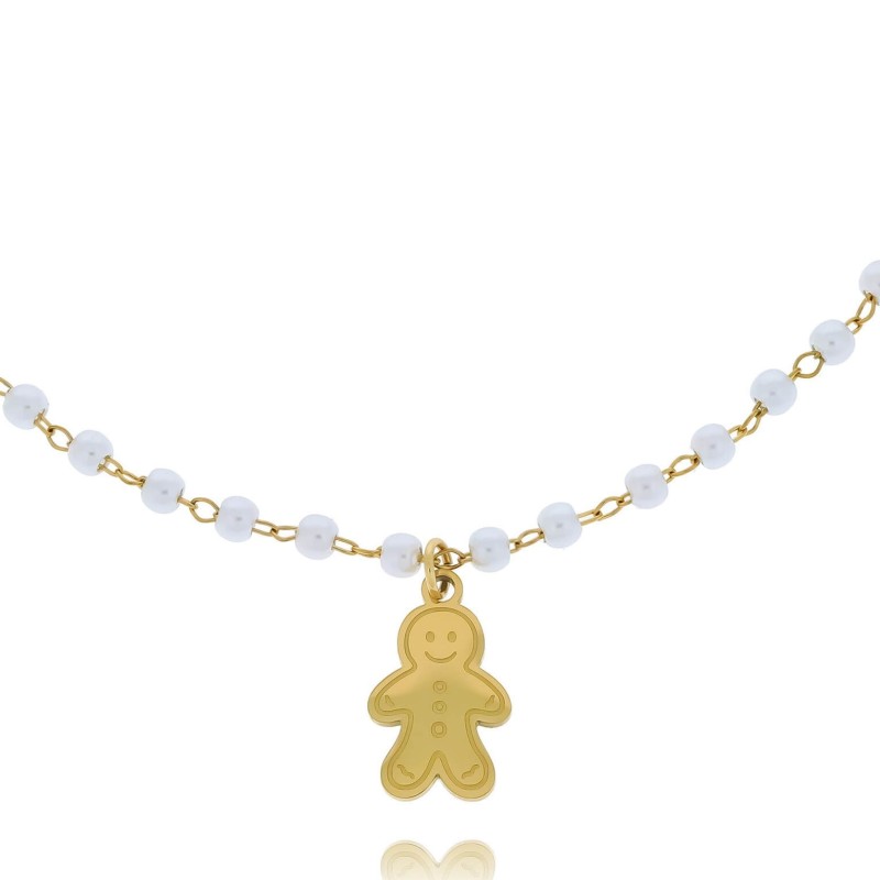 Bransoletka ze stali chirurgicznej z zawieszką w kształcie pierniczka i perłowymi koralikami