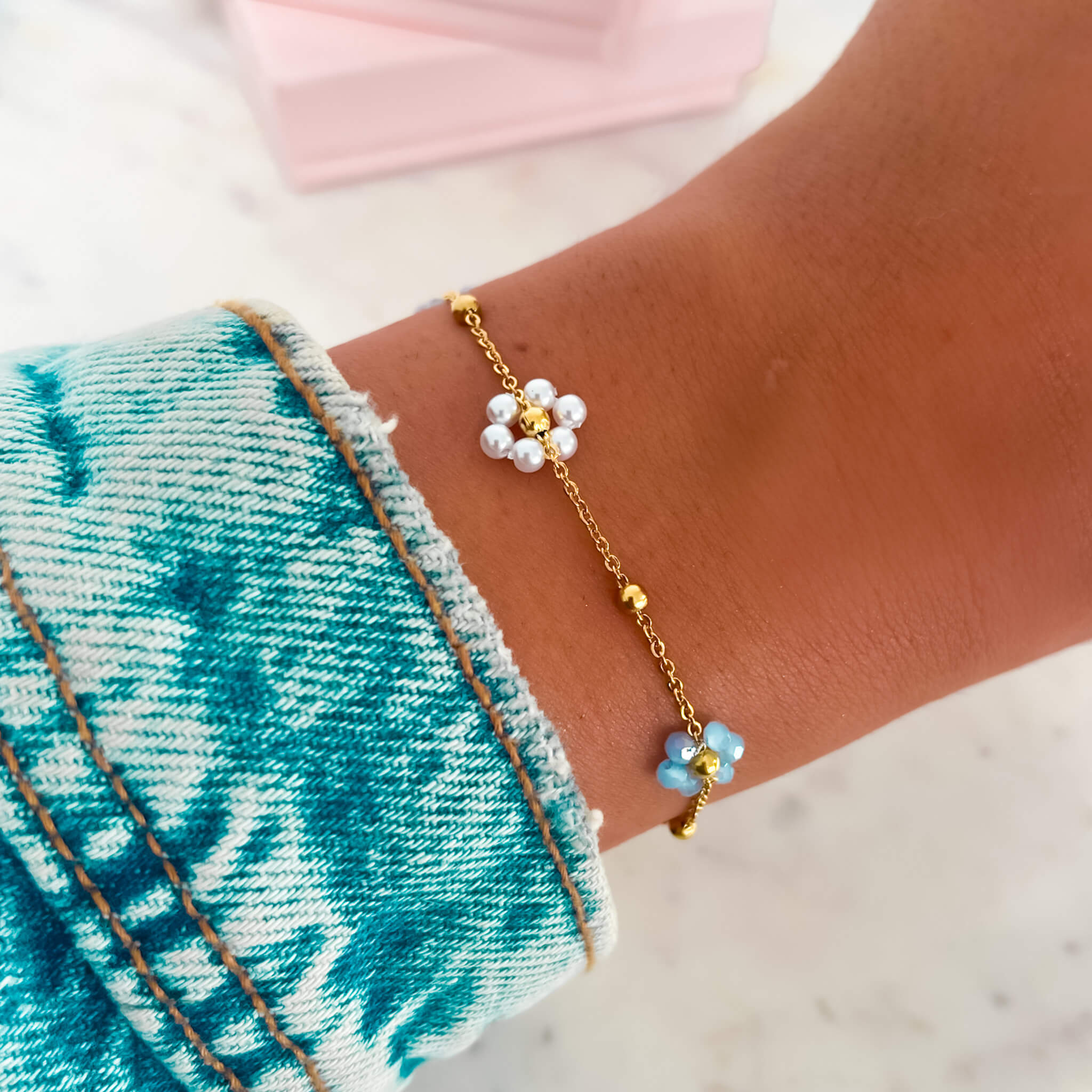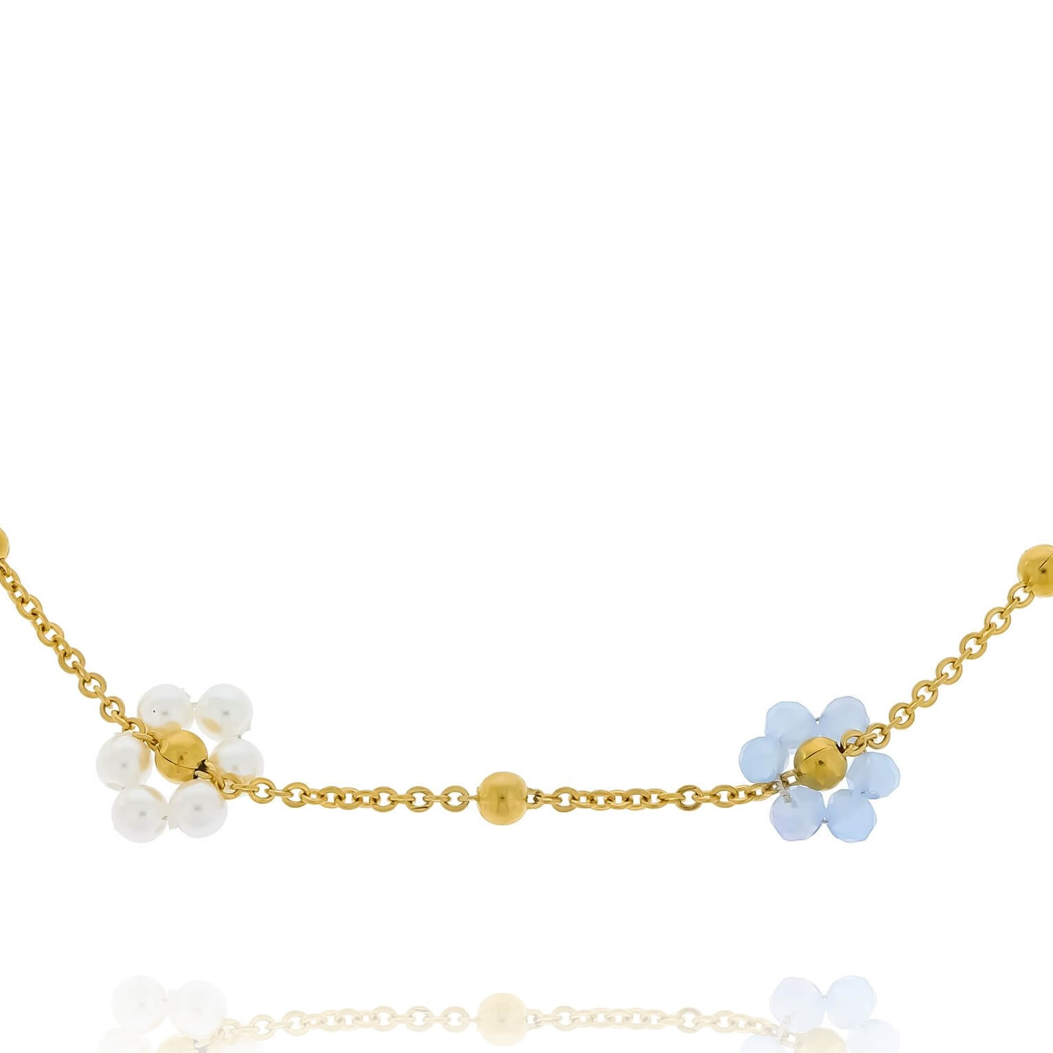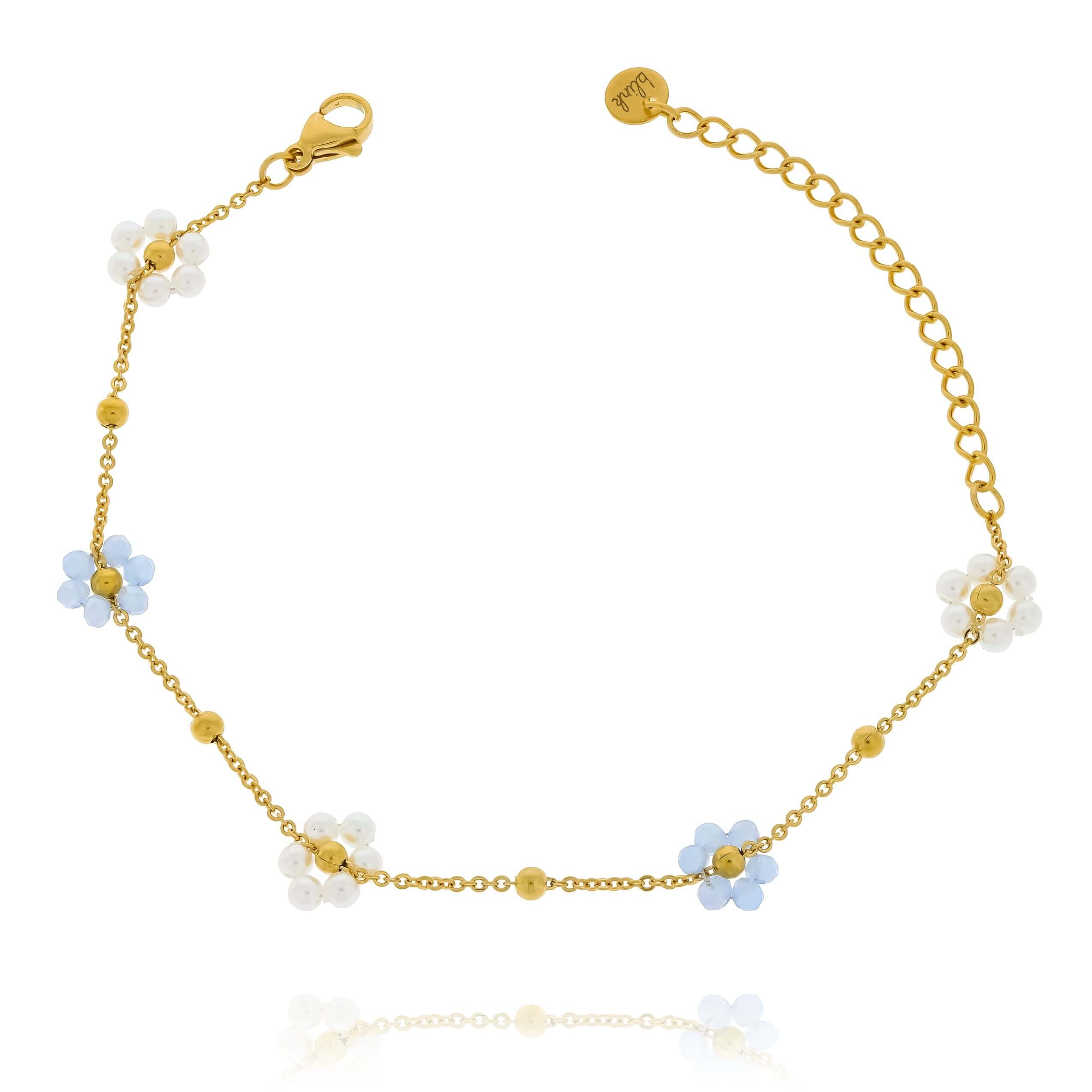 Bransoletka ze stali z niebieskimi i perłowymi kwiatkami koraliki