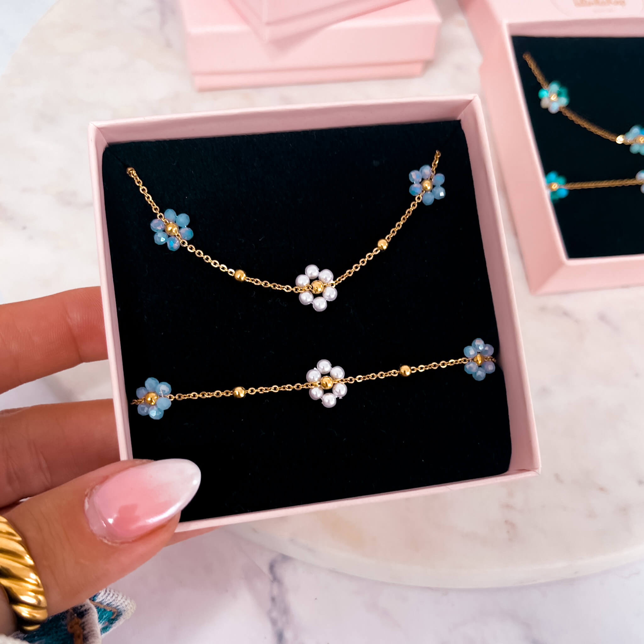 Bransoletka ze stali nierdzewnej z błękitnymi i perłowymi kwiatkami to elegancki dodatek, który subtelnie podkreśla nadgarstek. Stalowa baza zapewnia trwałość, a delikatne, niebieskie koraliki w kształcie kwiatków dodają jej uroku i lekkości. Na ręce wygląda stylowo i świeżo, idealnie komponując się z letnimi stylizacjami lub jako subtelny akcent na co dzień. Ta bransoletka to doskonały wybór dla osób ceniących zarówno modę, jak i wytrzymałość biżuterii.