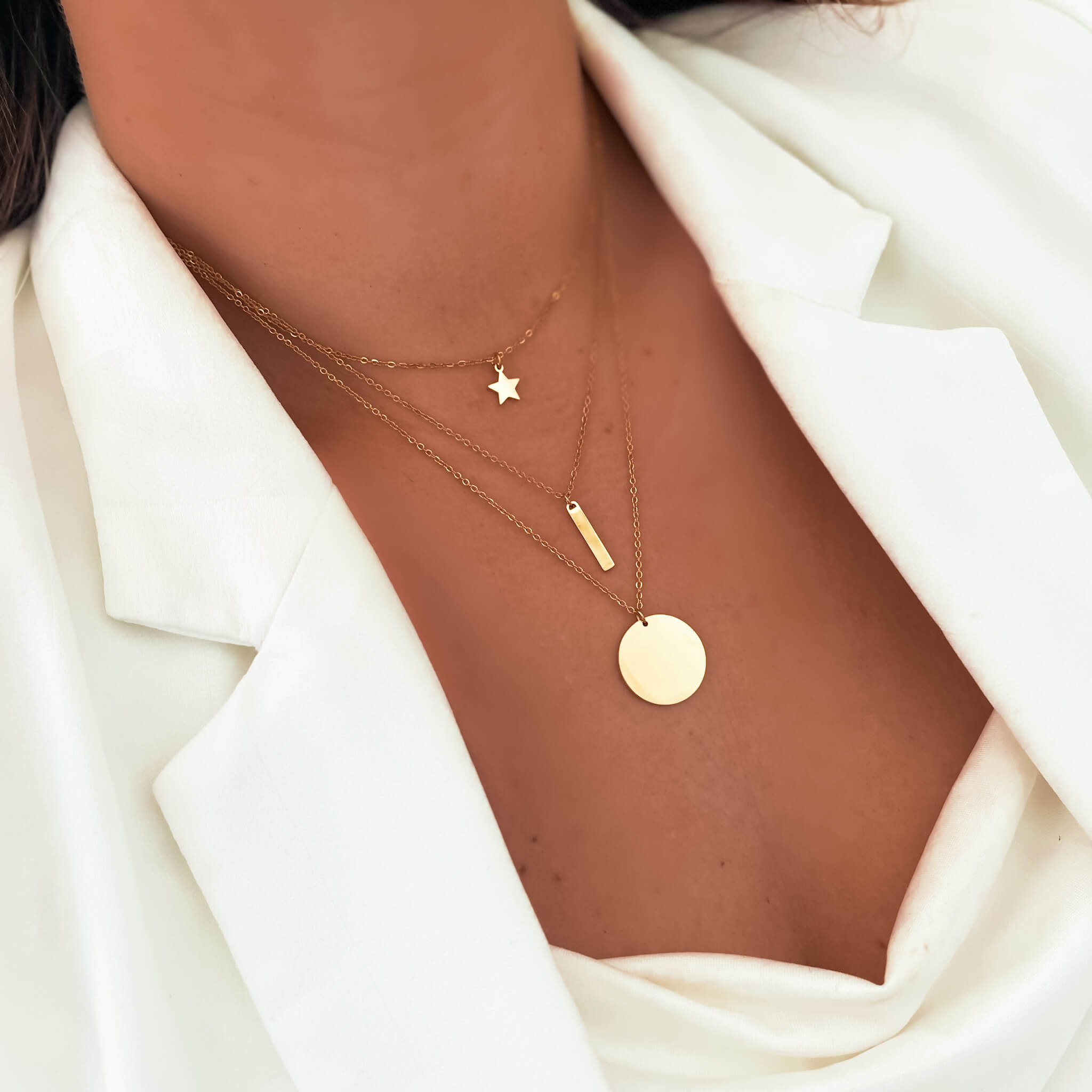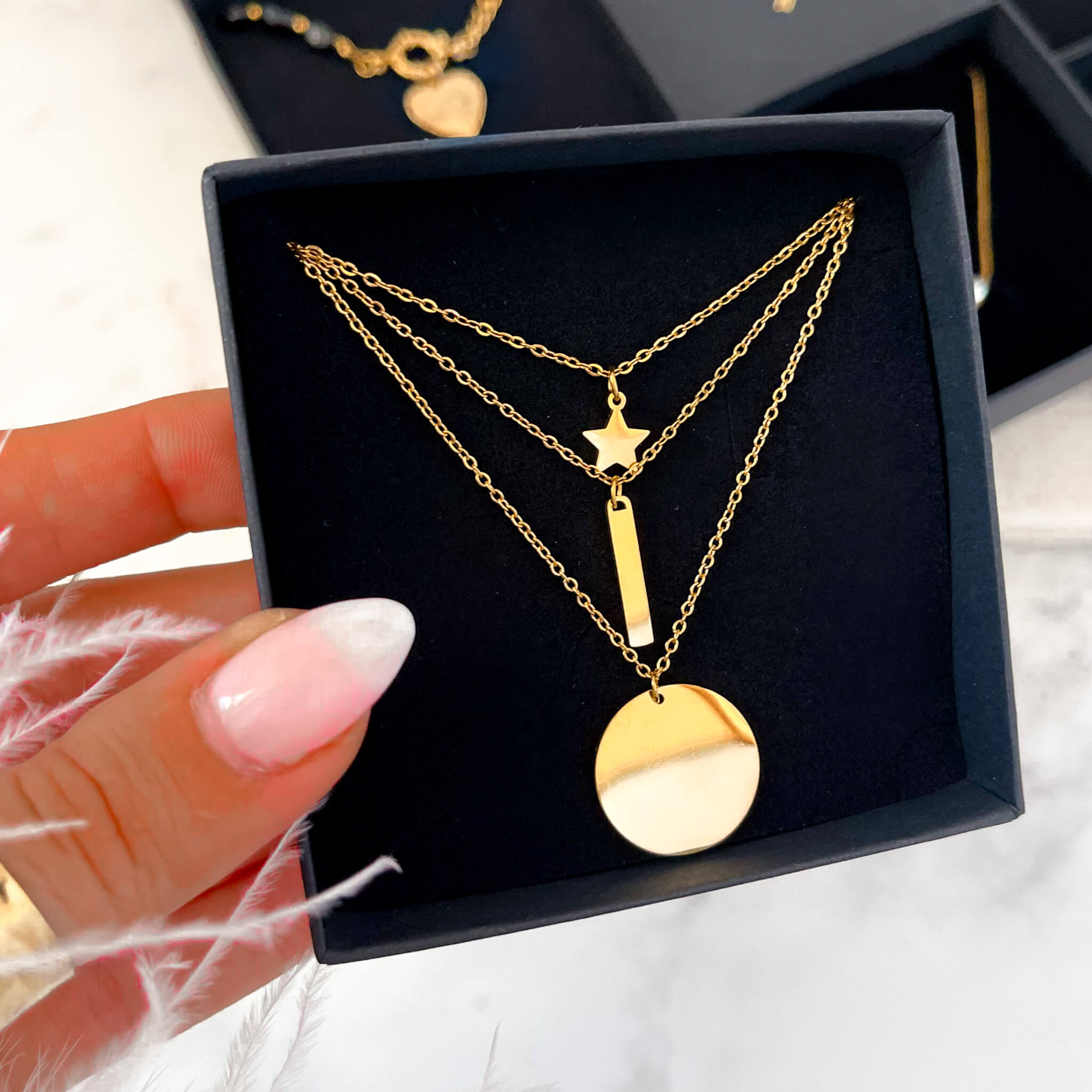 Ten unikatowy naszyjnik prezentuje się niezwykle efektownie i elegancko. Zawieszki dodają mu wyjątkowego uroku, a złote łańcuszki subtelności i klasy. To idealny dodatek do niemal każdej stylizacji, który doda Twojemu wyglądowi niepowtarzalnego charakteru. Dzięki swojej lekkości i finezji naszyjnik pięknie opada, delikatnie otulając szyję. Blaszka dodaje mu wyjątkowego uroku. Długość łańcuszków jest tak dobrana, aby naszyjnik idealnie pasował do dekoltu, podkreślając jego urodę i dodając subtelnego blasku całej stylizacji.