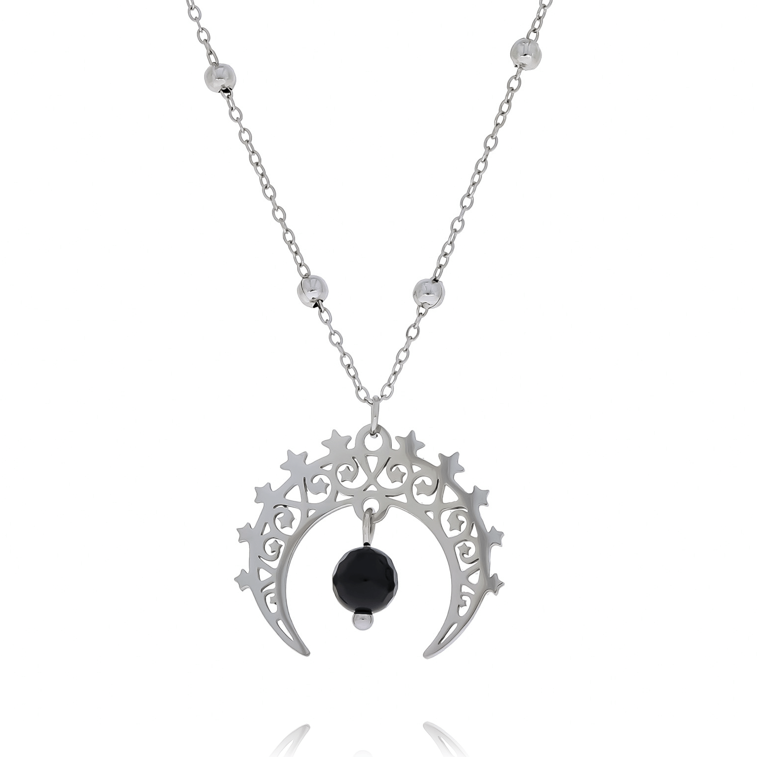 Naszyjnik srebrny z czarnym turmalinem – księżyc, stal chirurgiczna