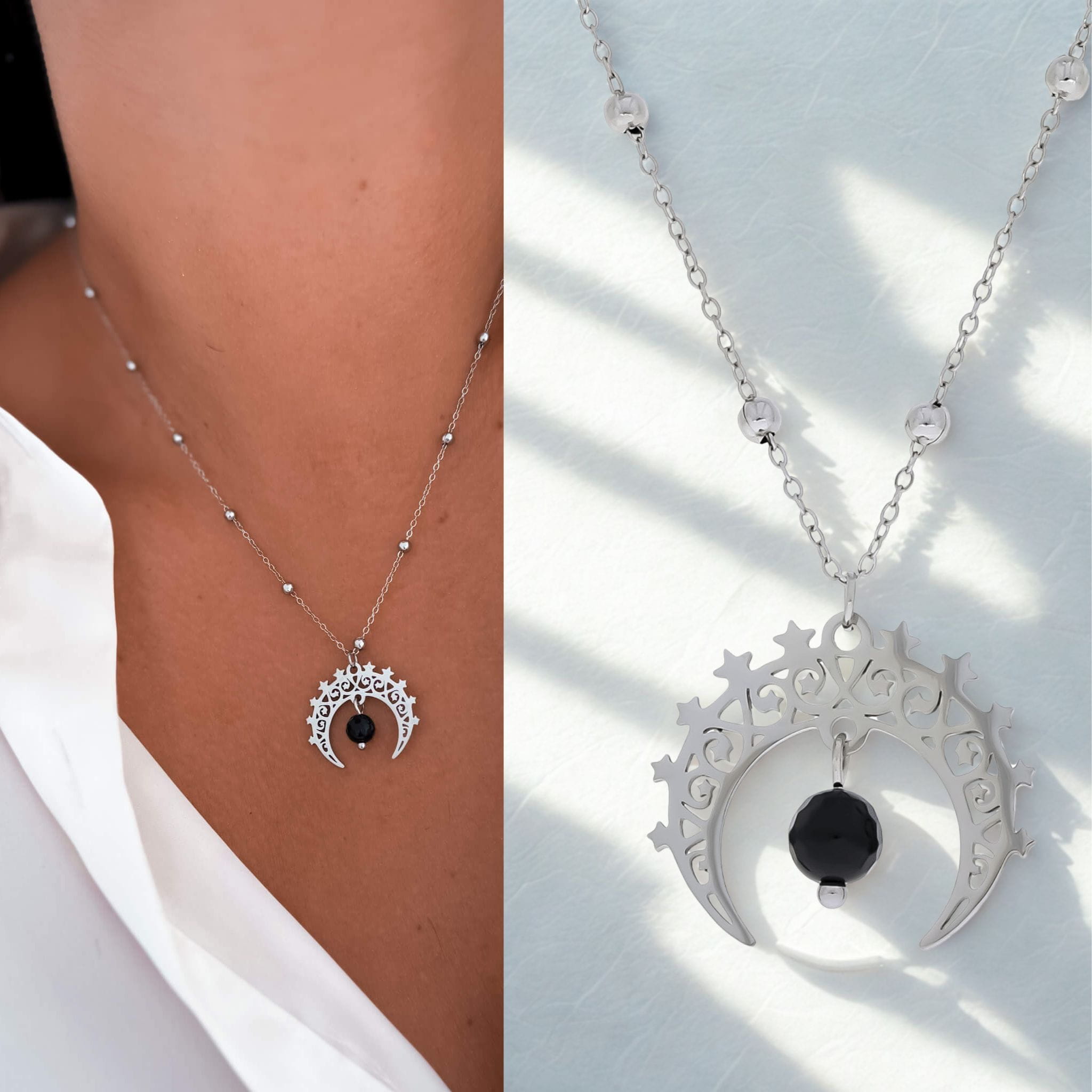 Wyjątkowy naszyjnik wykonany z najwyższej jakości stali szlachetnej 316L w kolorze srebra. Centralnym punktem jest naturalny czarny turmalin. Ażurowy wzór księżyca z gwiazdkami podkreśla oryginalny charakter i dodaje biżuterii subtelnego blasku.