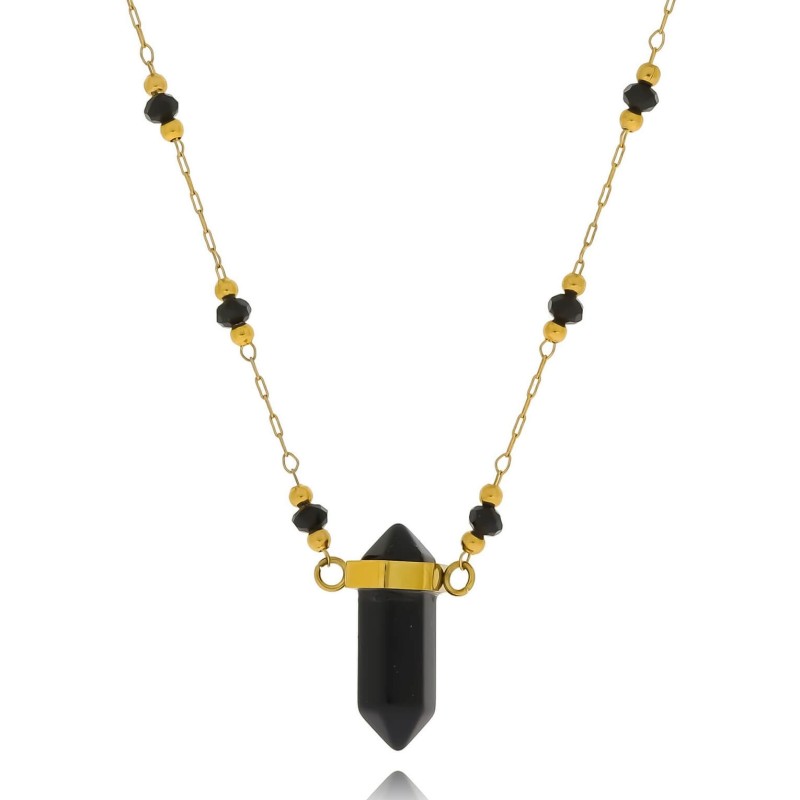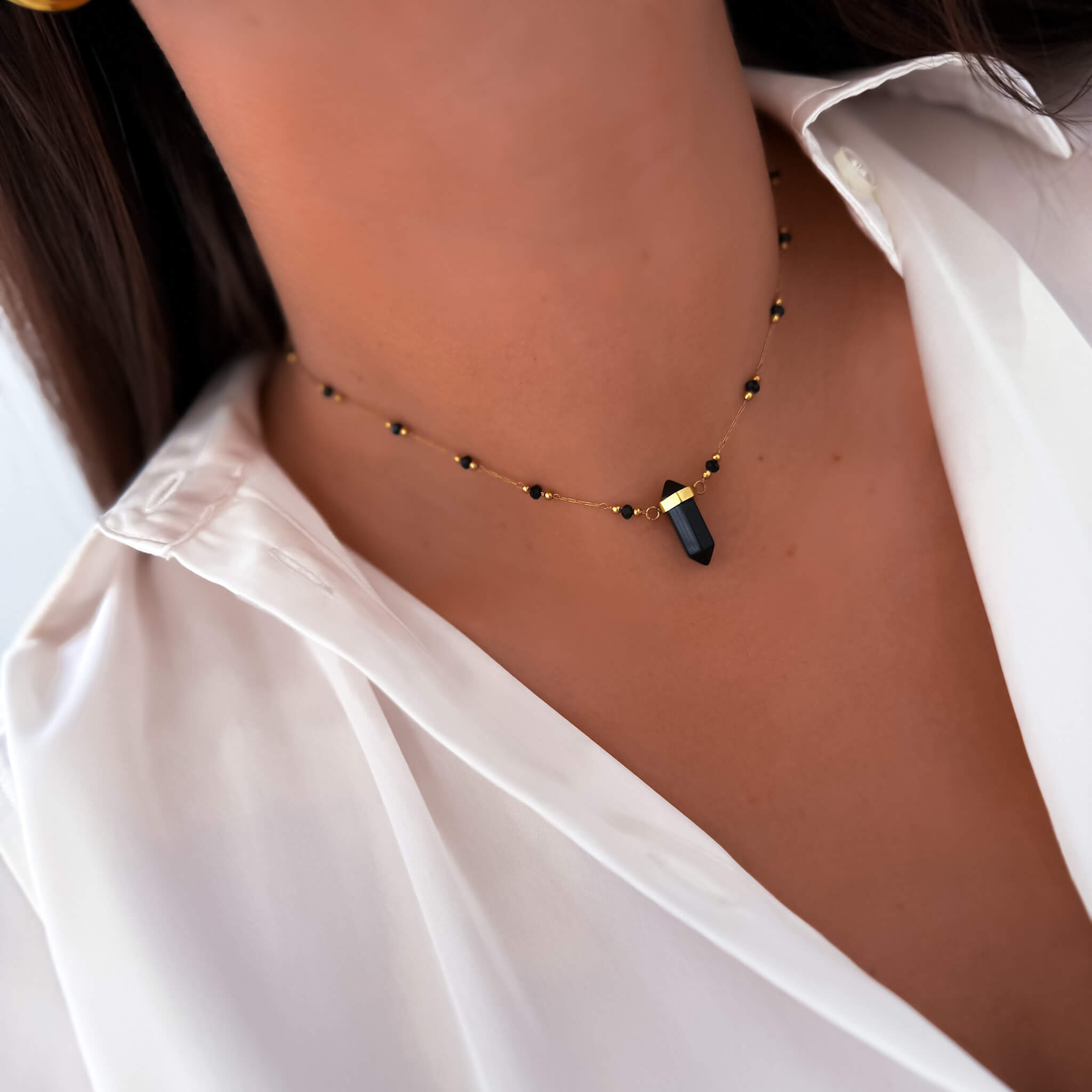 Naszyjnik z turmalinem i czarnymi koralikami łańcuszek ze stali