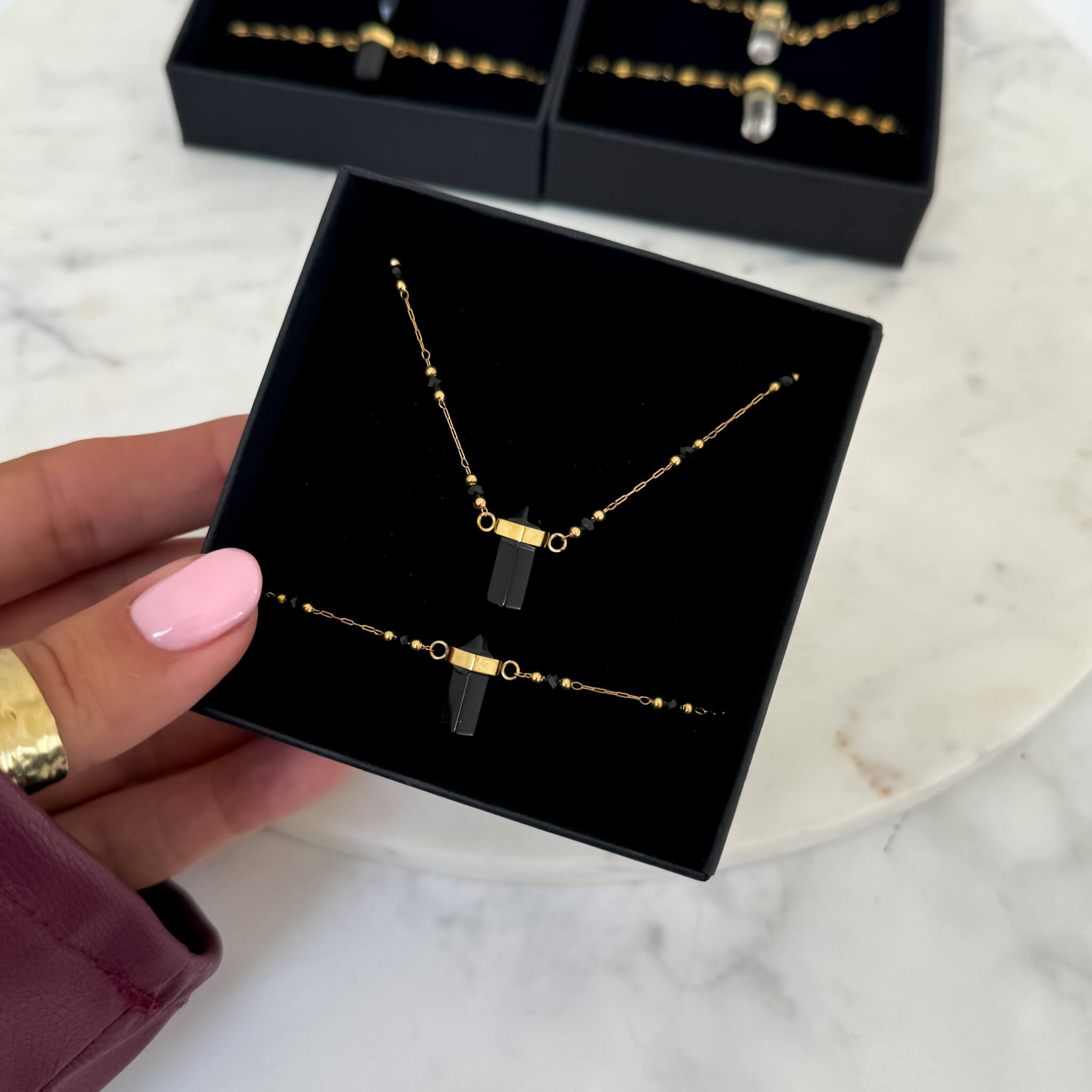 Ten naszyjnik ze stali szlachetnej z turmalinem i czarnymi koralikami to idealny wybór dla osób poszukujących stylowej, a zarazem ponadczasowej biżuterii. Turmalin, ceniony za swoje głębokie kolory dodaje całości niepowtarzalnego charakteru. Czarna kolorystyka i minimalistyczny design sprawiają, że naszyjnik doskonale pasuje do codziennych stylizacji, a także eleganckich okazji. Stal szlachetna gwarantuje trwałość i odporność na uszkodzenia, co czyni ten naszyjnik biżuterią na lata. Odkryj, jak idealnie może uzupełnić Twój styl.