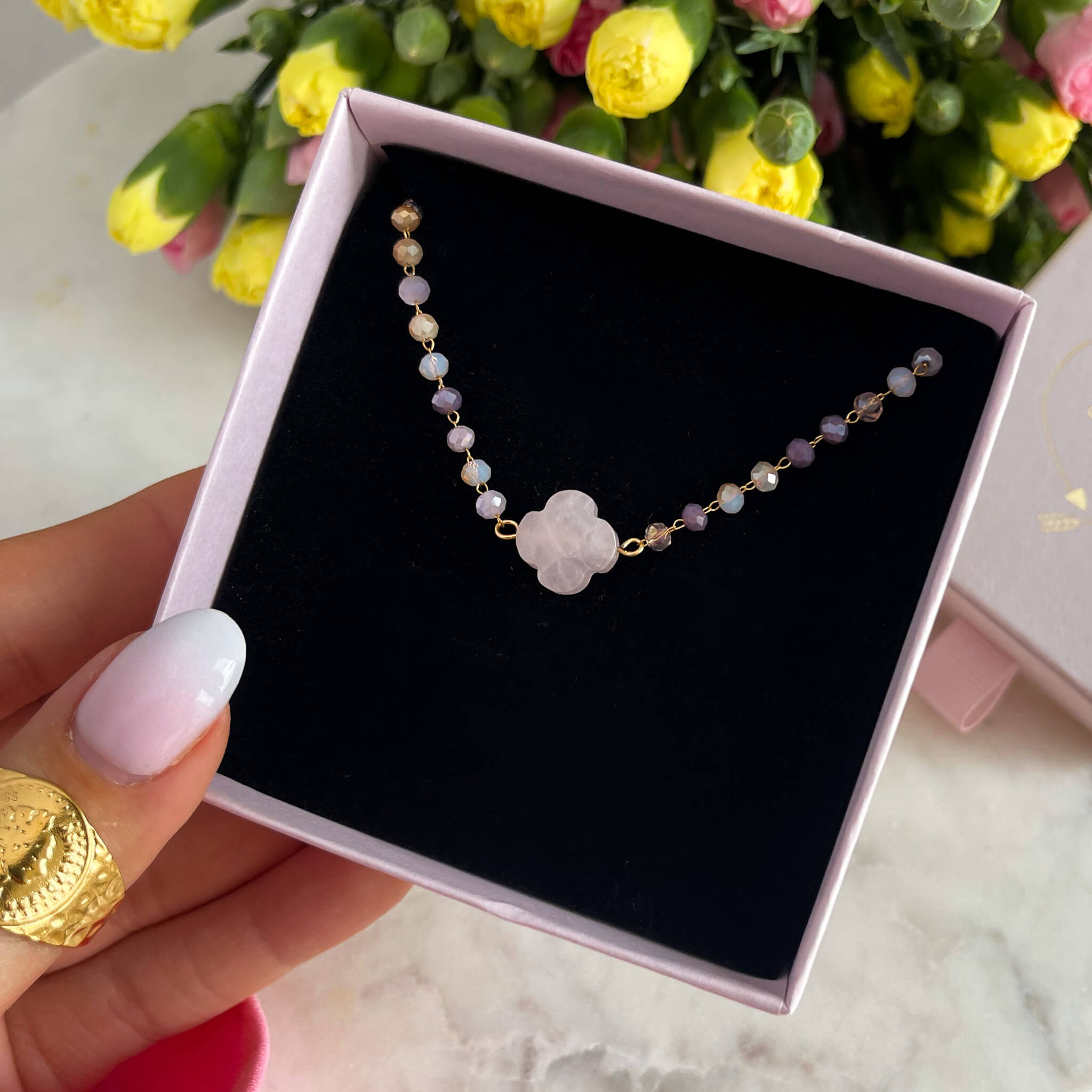 Podkreśl swój urok i delikatność naszym eleganckim naszyjnikiem ze stali chirurgicznej, ozdobionym kwarcem różowym w kształcie kwiatka oraz koralikami. To nie tylko biżuteria - to wyjątkowy symbol subtelności i klasy. Wykonany z trwałej stali chirurgicznej, nasz naszyjnik nie tylko podkreśla Twoją wyjątkowość, ale także zapewnia długotrwały blask. Kamień kwarcu różowego dodają o uroku