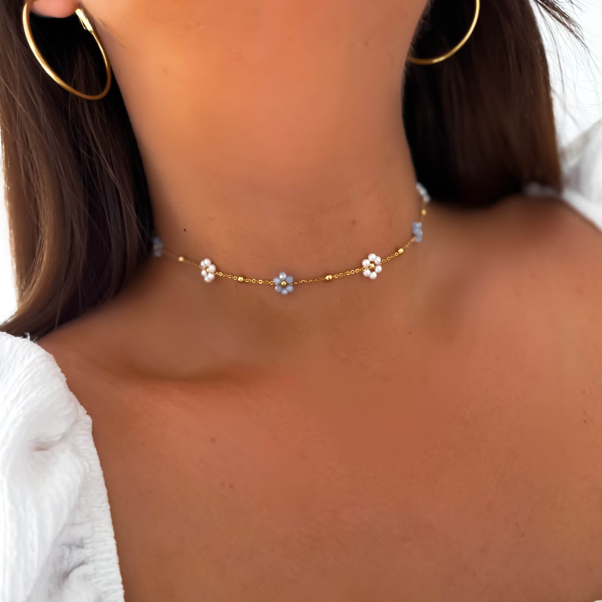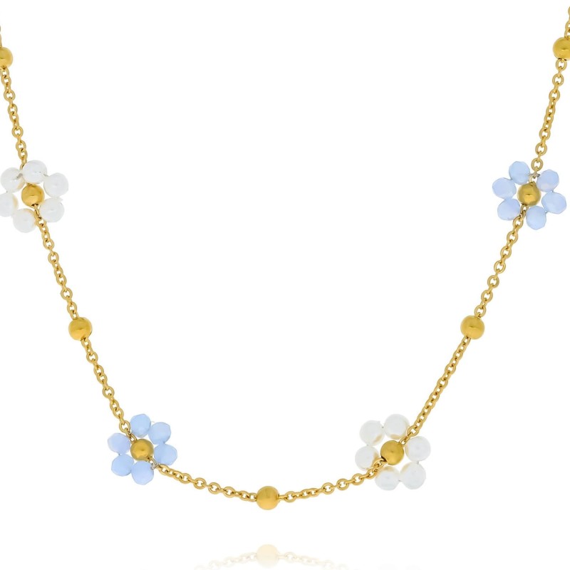Naszyjnik ze stali z niebieskimi i perłowymi kwiatkami