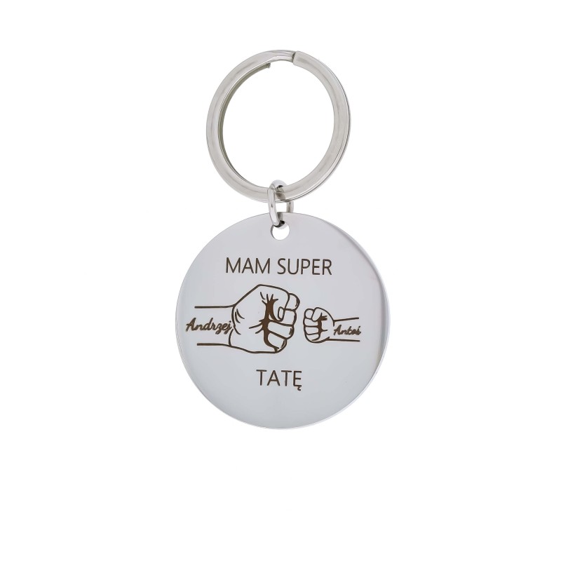 Okrągły brelok ze stali z grawerem mam super tatę i pięściami taty i dziecka – personalizowany prezent