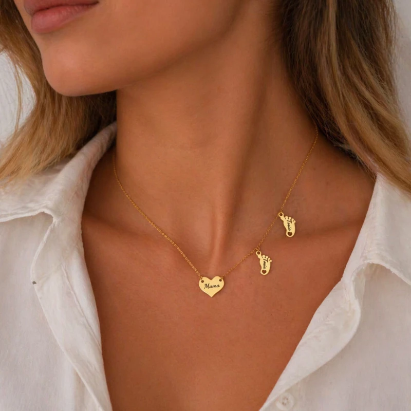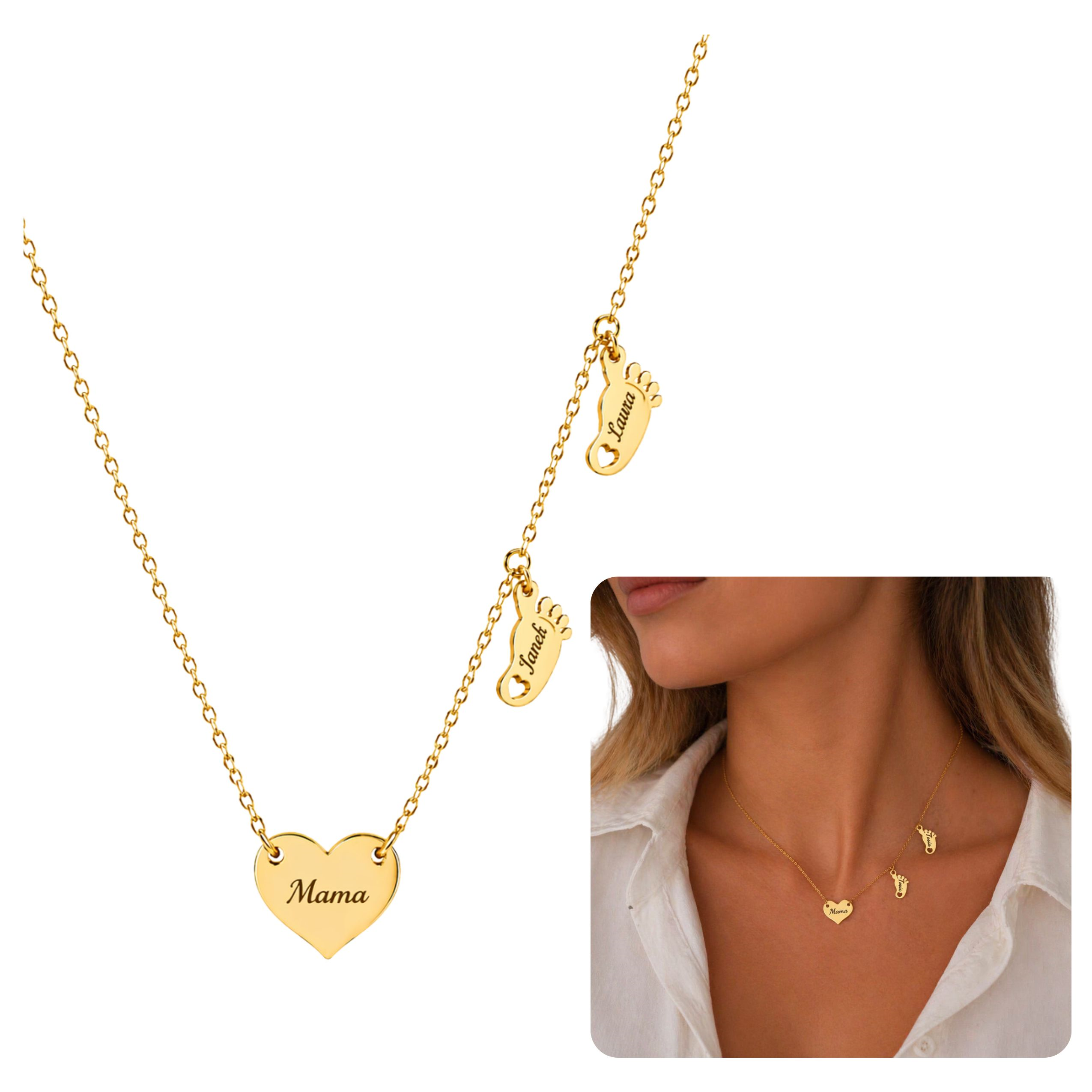 Personalizowany naszyjnik dla mamy – stal chirurgiczna, zawieszka serce Mama + 2 stópki z imionami