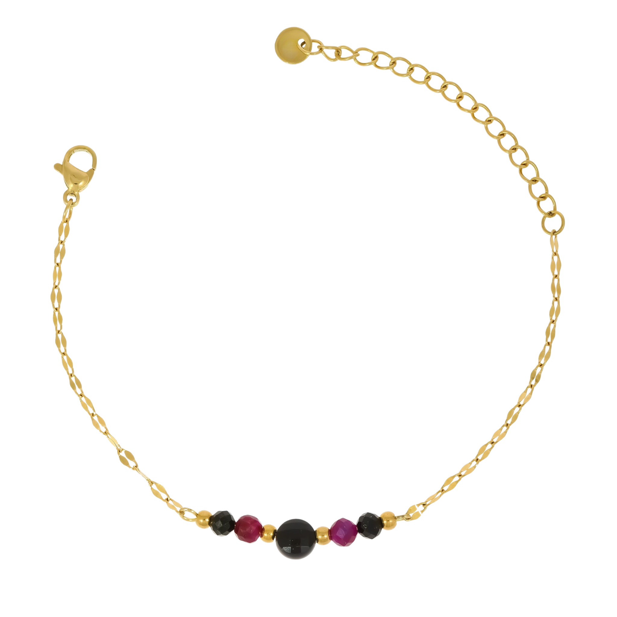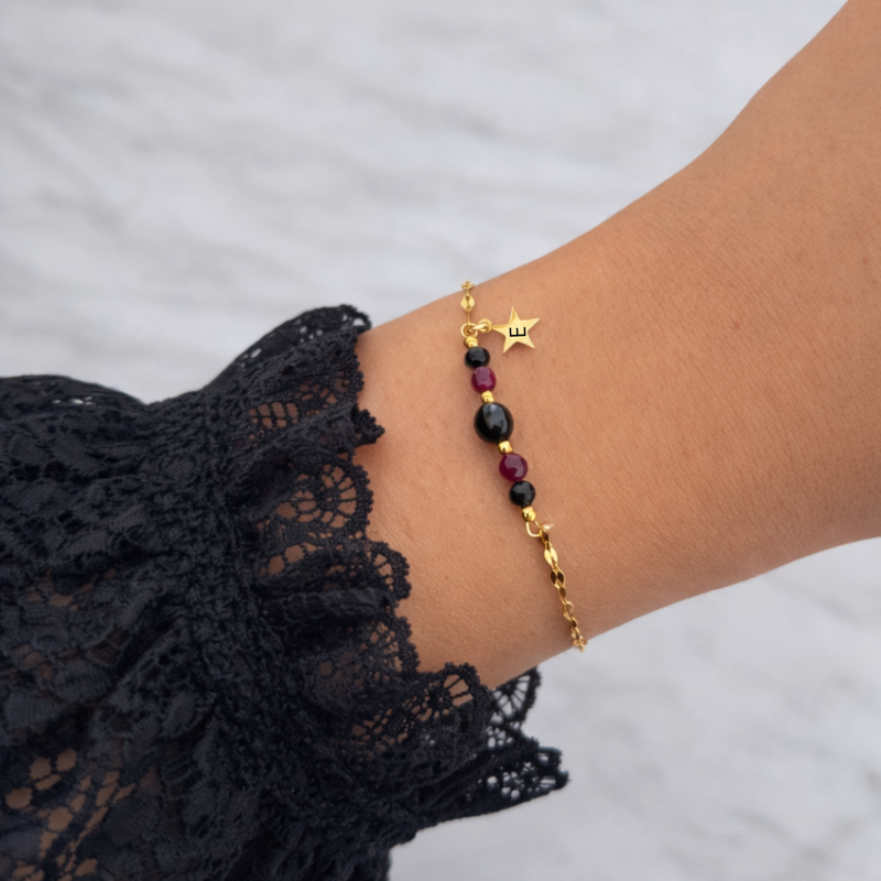 Delikatna złota bransoletka z kamieniami i motywem gwiazdki to połączenie subtelnej elegancji i nowoczesnej kobiecości. Starannie dobrane kamienie w odcieniach czerni i głębokiego bordo tworzą harmonijną kompozycję, a drobna zawieszka w kształcie gwiazdki dodaje biżuterii lekkości i symbolicznego charakteru. Złoty kolor stali chirurgicznej pięknie podkreśla nadgarstek, sprawiając, że bransoletka doskonale sprawdzi się zarówno na co dzień, jak i na wyjątkowe okazje.